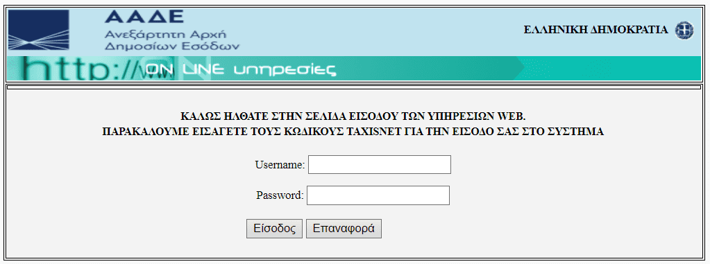 3. Στην σελίδα που θα μεταφερθείτε εισάγετε τους κωδικούς TAXISNET και πατήστε στο κουμπί «Είσοδος».